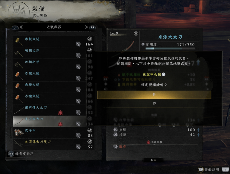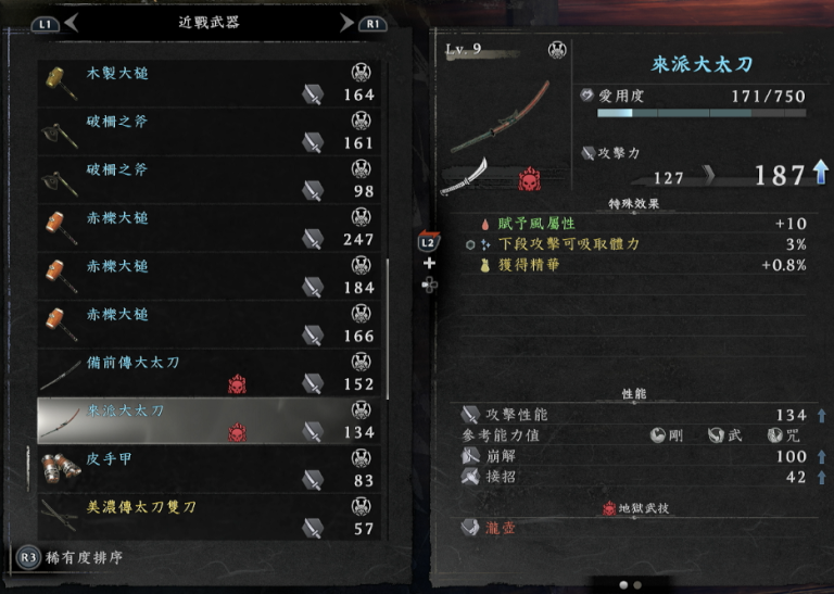 | 备前传太刀 | 心 | 武 | 智 | 69 | 38 | 上段架势攻击的精力消耗降低 -1.9% | ||