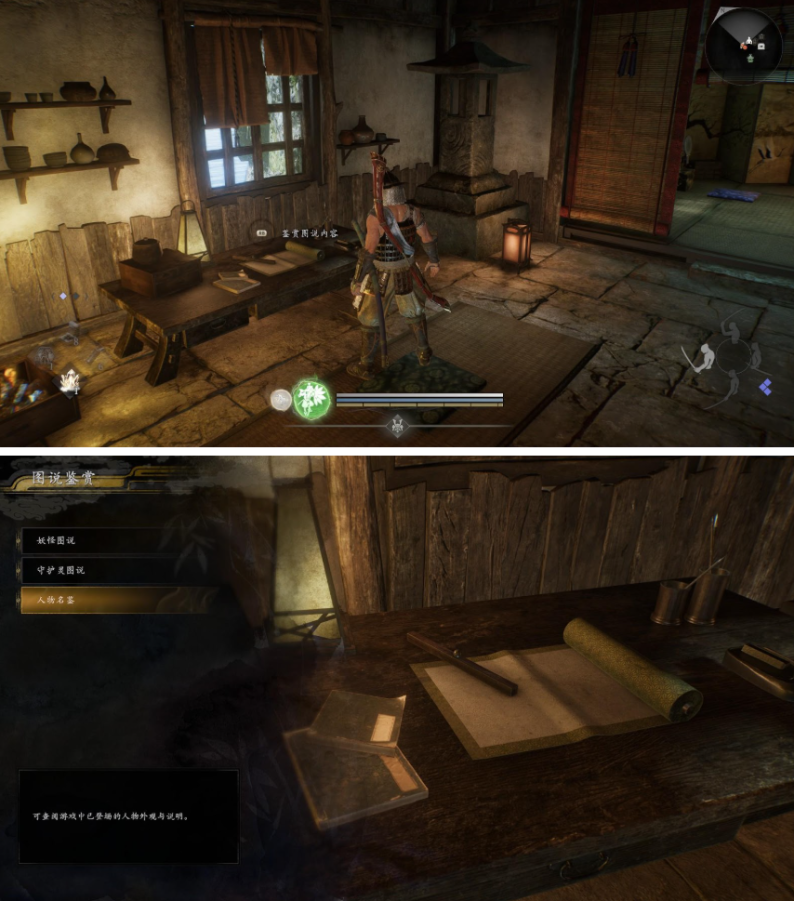 ①、妖怪图说,查看已知怪物的模型、传说描述(可能会有部分弱点和教学提示)。
